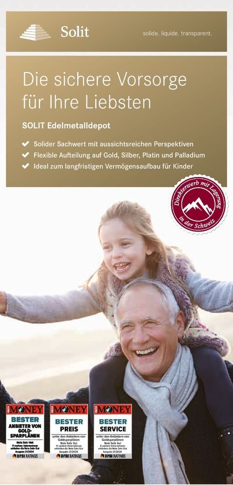 Alternativ können Sie mit einem Klick auf das Banner direkt ein Depot eröffnen. Bereits ab 2.000 € einmalig oder 50 € monatlich können Sie das Fundament für Ihre "goldene Zukunft" legen. Haben Sie Fragen? Wir sind für Sie da!